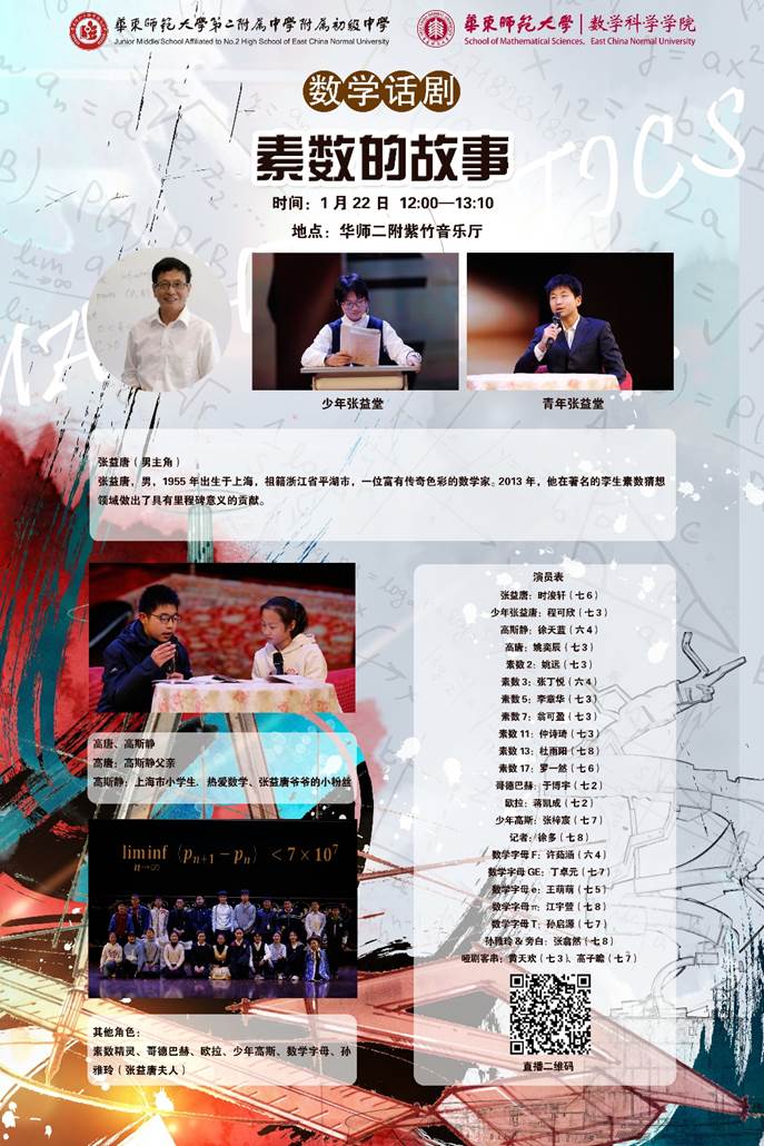 原创数学话剧《素数的故事》以张益唐先生的数学传奇人生为主线,讲述和呈现了素数星空下的七彩故事。这里收藏的是2021年1月22日的这一数学话剧的直播回放视频。本次活动由成人电影 与华东师大二附中附属初中联合主办。