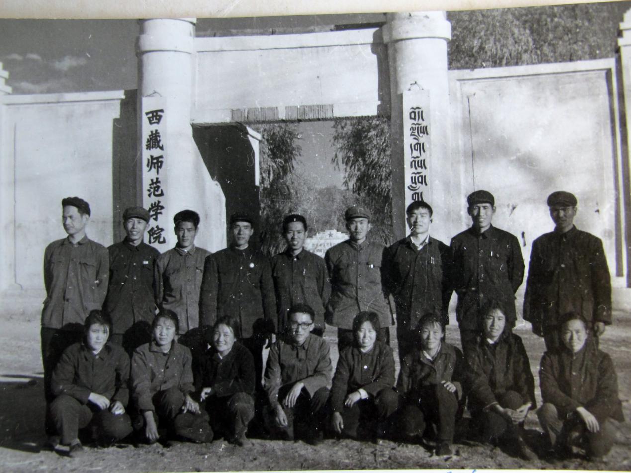 数学专业的藏汉老师在西藏师范学院校门口合影。后排的左1、右2、右3分别是周延昆、徐剑清、王仁义。