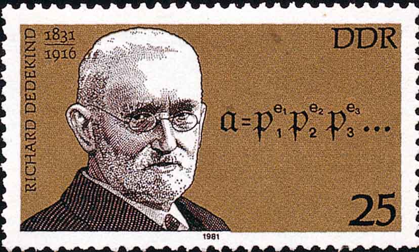 至于无理数的被发现那是很早的事. 公元前500年, 古希腊毕达哥拉斯(Pythagoras)学派的弟子希勃索斯(Hippasus)就发现一个正方形的对角线与其一边的长度是不可公度的(这可能是√2所表示的数, 最早被认识). 此外, 还有圆周率π(本刊2009年第3期), 黄金分割数Φ=(√5+1)/2(本刊2009年第1期), 自然对数的底e(图5左下方部分是e的级数形式)等等这类新数(相对于有理数而言)不断地被发现. 由此引发的数学危机一直延续到19世纪. 1872年, 德国数学家戴德金(Dedekind, J. W. R. 1831-1916, 图6)从连续性的要求出发, 用有理数的“分割”来定义无理数, 并把实数理论建立在严格的科学基础上, 从而结束了无理数被认为“无理”的时代, 也结束了持续2000多年的数学史上的一次大危机.