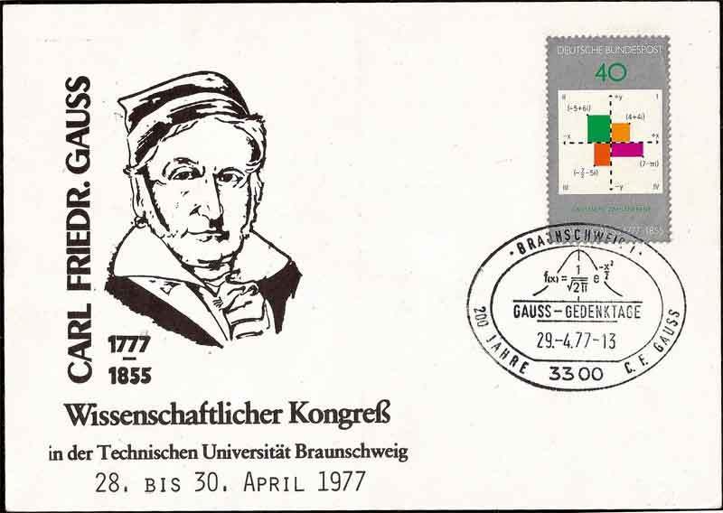 1795年,高斯进入哥廷根大学。1796年3月30日,当他差一个月满19岁时,他用代数方法给出只用直尺和圆规作圆内接正17边形的方法 — 《正十七边形尺规作图之理论与方法》,这是一个有着二千多年历史的数学悬案。为了纪念他少年时期这一重要的发现, 他希望死后在他的墓碑上能刻上一个正17边形 (图2是1977年原民主德国纪念高斯诞生200周年邮票,图中右方是圆规与无刻度直尺。 图3是1977年原联邦德国为高斯诞生200周年首日封,邮票图案是复平面;邮戳为正态分布曲线和公式)。 1799年,高斯获博士学位,他的博士论文是证明在复数域里任何一元代数方程都有一个根。这个结论被称为“代数基本定理”,也称为“高斯定理”。