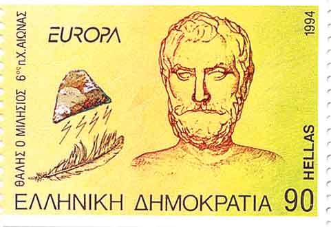 古希腊科学家泰勒斯(Thales,约公元前624-公元前547,图2为1994年希腊发行的纪念泰勒斯的邮票)曾计算出公元前585年的一次日食, 并因此平息一场战争。他也是首次运用相似三角形原理测出埃及金字塔高的学者。