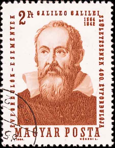 意大利天文学家伽利略(Galileo Galilei,1564-1642,图4为1971年匈牙利发行的纪念伽利略诞生400周年的纪念邮票) 年轻时最喜欢的书是欧几里得的《几何原本》和阿基米德的著作。1589年,他25岁时获得比萨大学数学和科学教授的职位。 1609年,伽利略创制了天文望远镜观察天体,他绘制出了第一幅月面图。1610年1月7日,伽利略发现了木星的四颗卫星, 为哥白尼学说找到了确凿的证据,标志着哥白尼学说开始走向胜利。