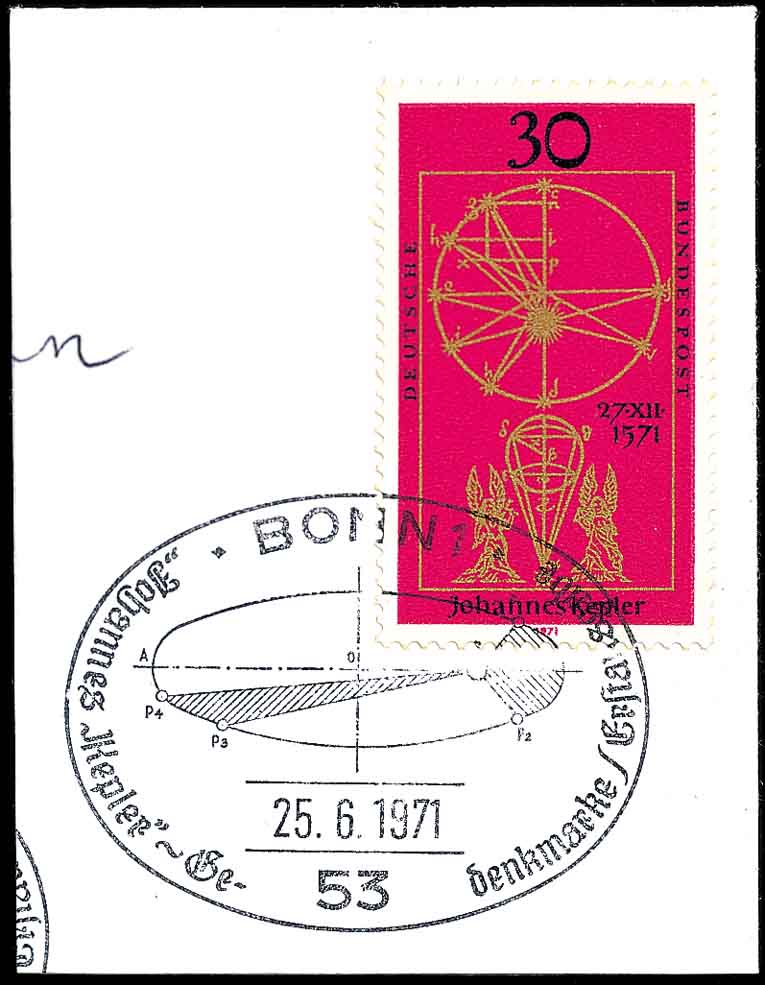 德国天文学家开普勒(Johannes Kepler,1571-1630,图5为1964年德国发行的纪念开普勒诞生400周年邮票和邮戳)正是凭借着自己的数学才能, 才发现了行星运动的三大定律。他还提出行星沿椭圆轨道运行,太阳处在椭圆的一个焦点上。正因他对二次曲线的研究,才把“焦点”一词引入数学。