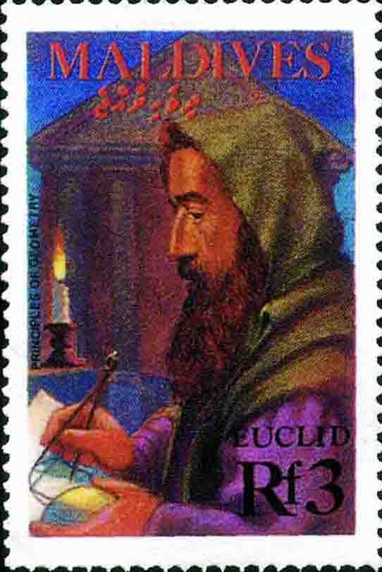 但毕达哥拉斯对勾股定理的证明已经失传. 古希腊数学家欧几里得 (Euclid, 公元前 330 -- 公元前 275, 图 6 是 1988 年马尔代夫发行的纪念欧几里得的邮票) 在《几何原本》中给出了一个证明. 并称它为毕达哥拉斯定理.