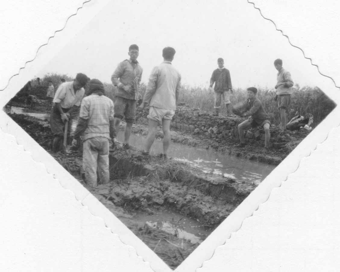 你看:迎风站立的这一排“雄赳赳”手拿饭碗的学生与背景,就是当时围垦“战士”与工地的写真。记得开工第一天,后勤跟不上,不干吧冷,干吧饿, 一直等在工地上“埋锅造饭”到下午二点多才开粥,那真是饥寒交迫啊!后来常溪萍校长惦着大家艰苦,专门派总支书记刘维南送来“咸肉菜饭”。 这一顿夜饭,在当时围垦高校中传为美谈,可把交大、复旦等校的“战士”们“馋煞”哉!