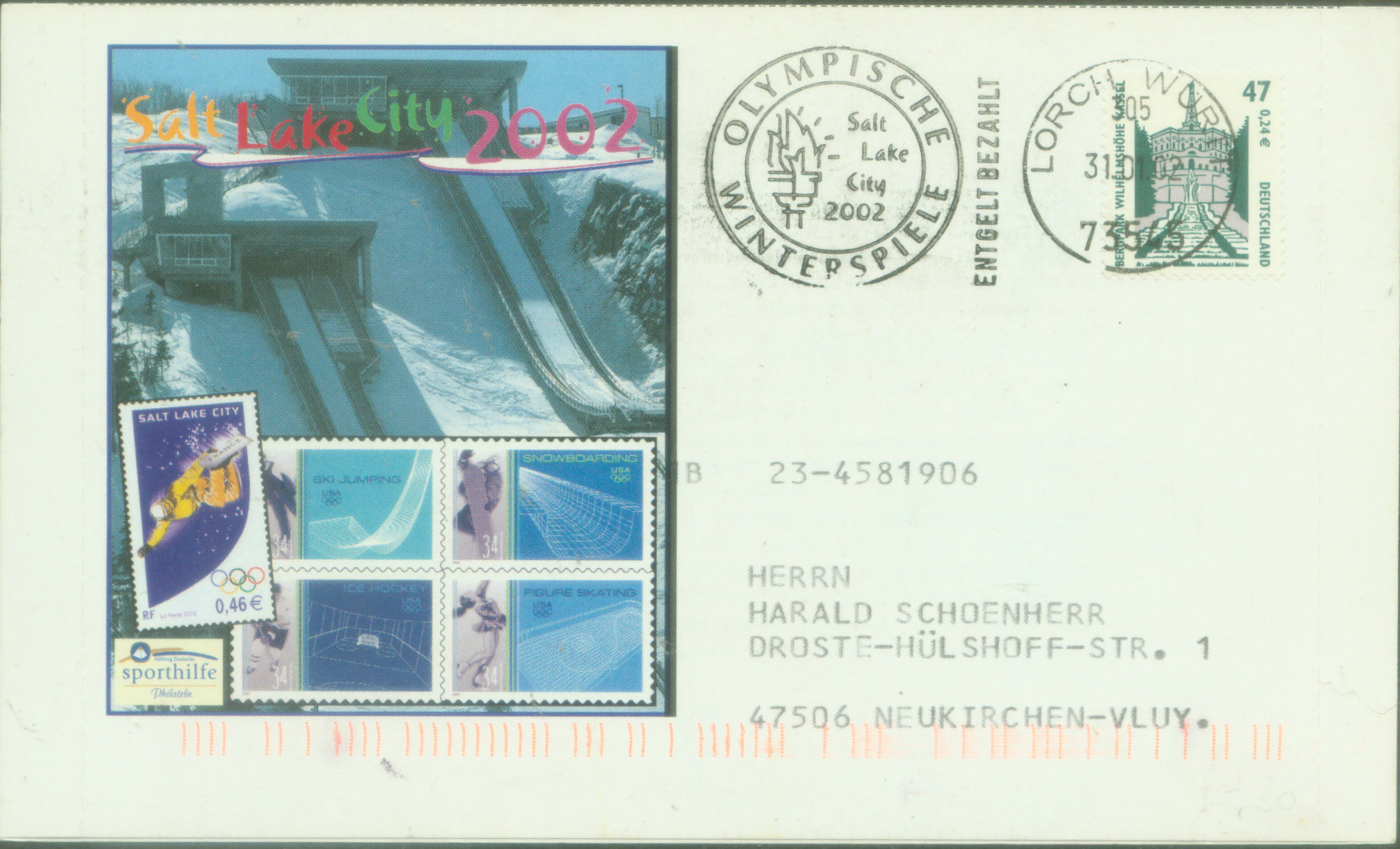 前面已经说过,第19届冬奥会2002年在美国犹他州盐湖城举办。图11是德国为这届冬奥会发行纪念信封,信封的正反面印有滑雪跳台和法国、美国、德国、加拿大为这届发行的纪念邮票。 这届冬奥会重大新闻是盐湖城奥申委贿赂国际奥委会官员的丑闻,一时引起轩然大波。这一事件导致多名国际奥委会官员宣布辞职或被解职。 图11是由德国巴登·符腾堡州的洛尔希2002年1月31日寄往北莱茵·威斯特法伦州的诺伊基兴。