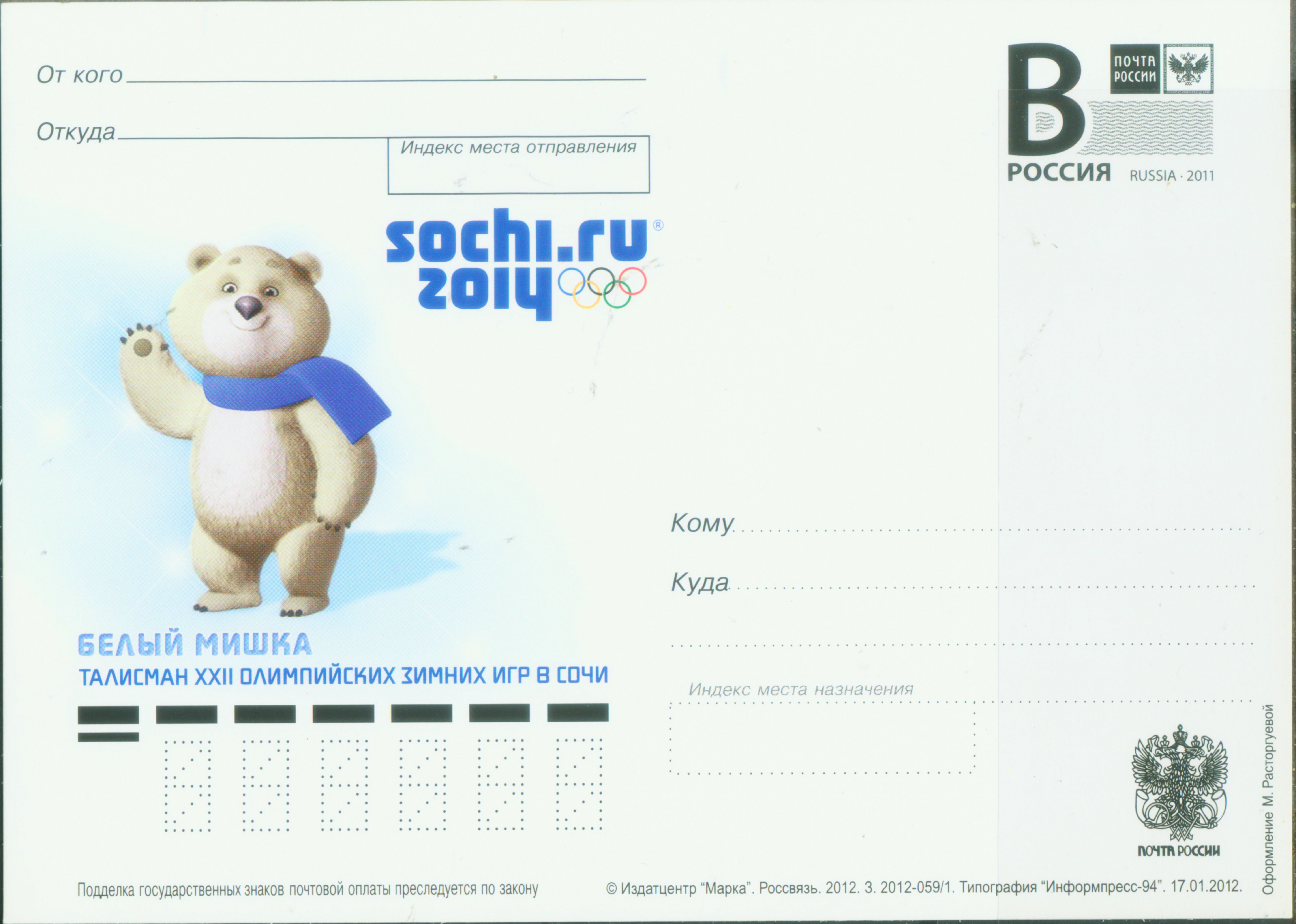 第22届冬奥会于2014年在俄罗斯索契举行。这是俄罗斯历史上第一次举办冬季奥运会。图12是俄罗斯为这届冬奥会于2012年发行的邮资明信片,它的左边是这届冬奥会的吉祥物雪豹和会徽。 中国国家主席习近平出席了这届冬奥会开幕式。中国代表团以5金、2银、4铜的成绩排名第七位。