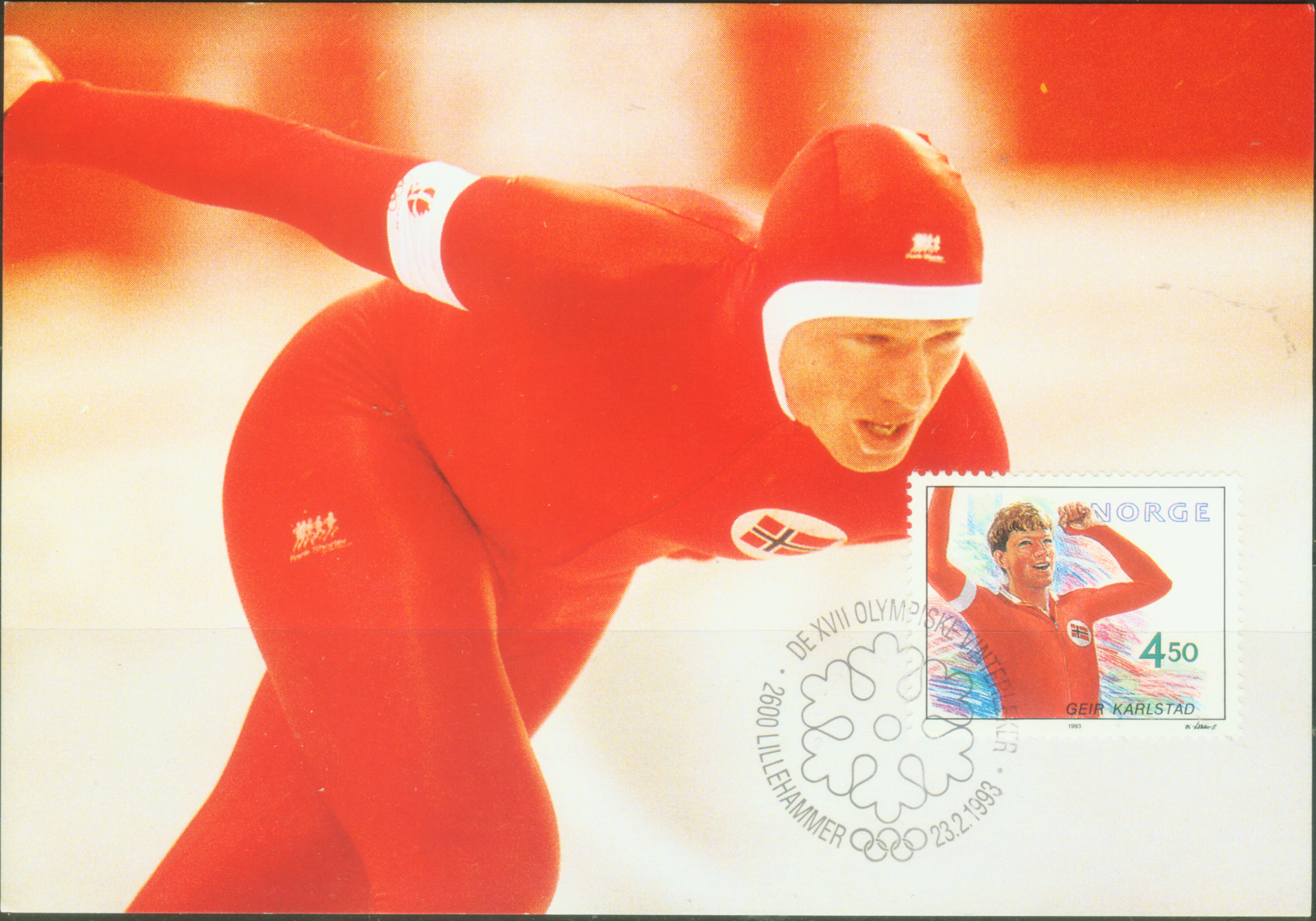 在1992年冬奥会上挪威选手卡尔斯塔德在男子5000 m比赛中以6′59.97"的成绩获得金牌。图16是次年(1993)挪威为他发行了纪念邮票,并制作了极限片。