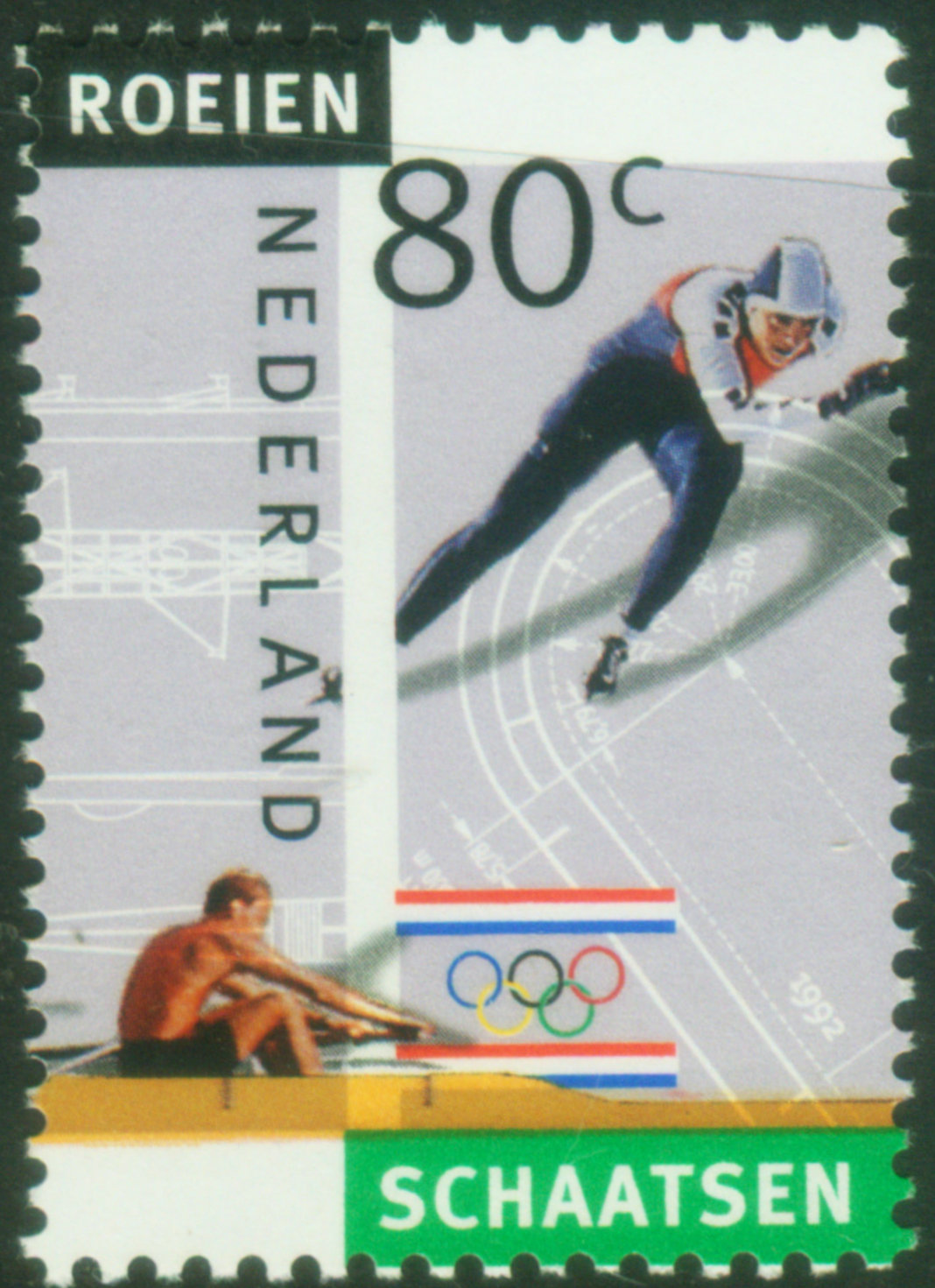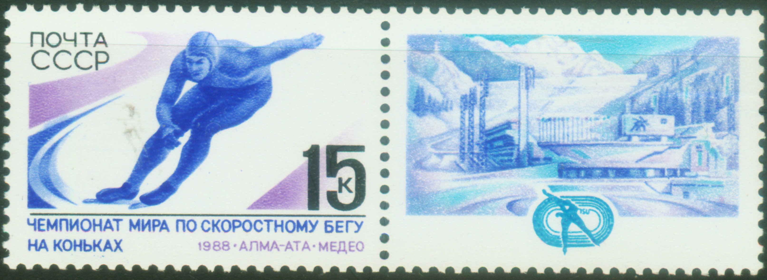 短道速滑:短道速滑一般是指在室内人工冰场上进行的速度滑冰比赛(图17是苏联为1988年冬奥会发行的室内场馆邮票,图18是1992年荷兰发行的冰场跑道邮票)。在室内冰场比赛避免了所受自然界的影响。 比赛场地的大小为30×60 m,跑道每圈的长度为111.12 m,直道宽≥7 m,弯道半径8 m,直道长28.85 m。现在已经将所有的滑冰比赛都安排在室内场馆举行。