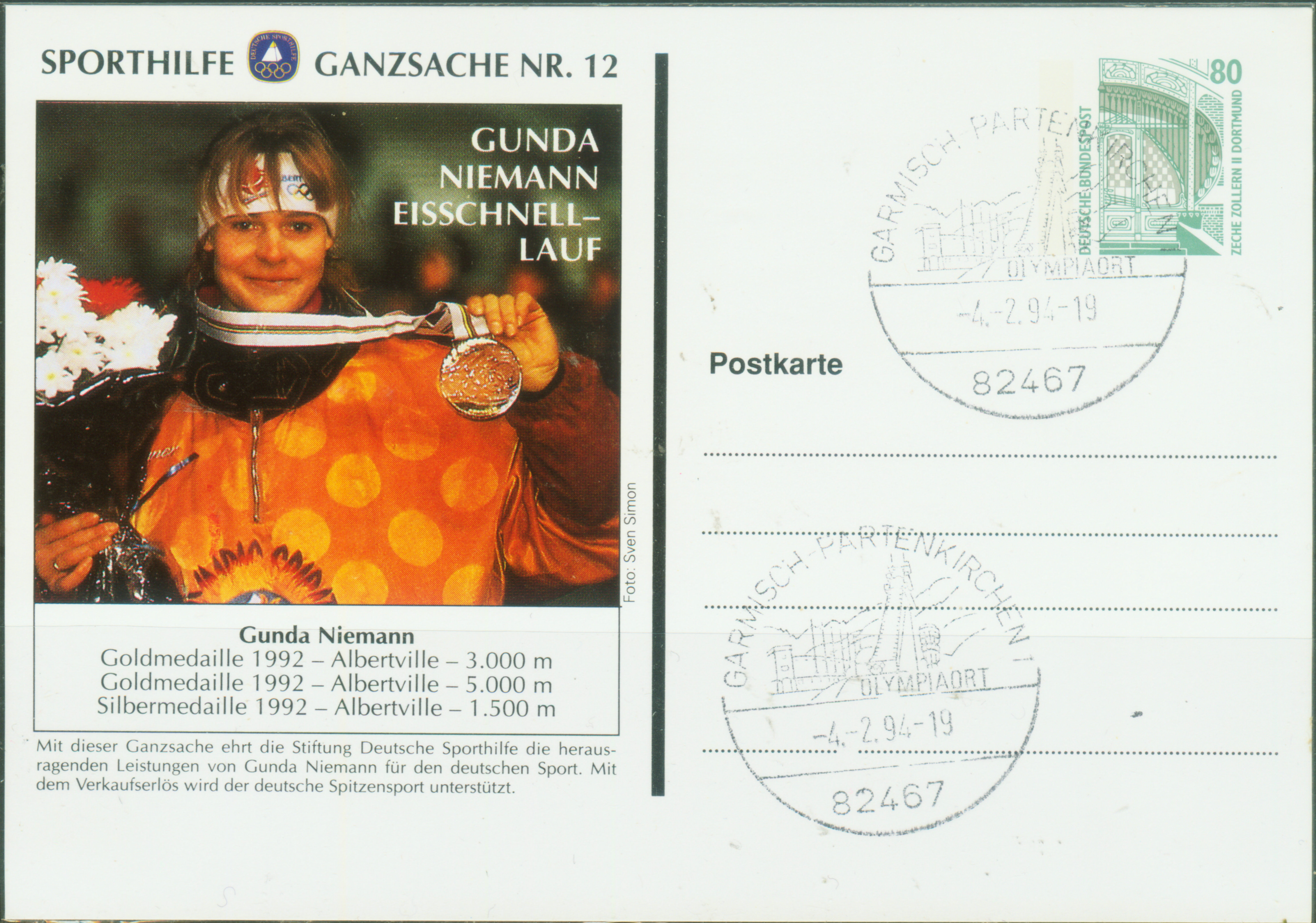 在1992年法国阿尔贝维尔冬奥会上短道速滑才列为冬奥会正式比赛项目。当时德国的尼曼在女子3000 m和5000 m获得金牌,1500 m获得银牌 (图19是1994年德国为祝贺尼曼获得三枚奖牌发行的加印邮资明信片);1992年冬奥会中国李琰获得女子500 m银牌。