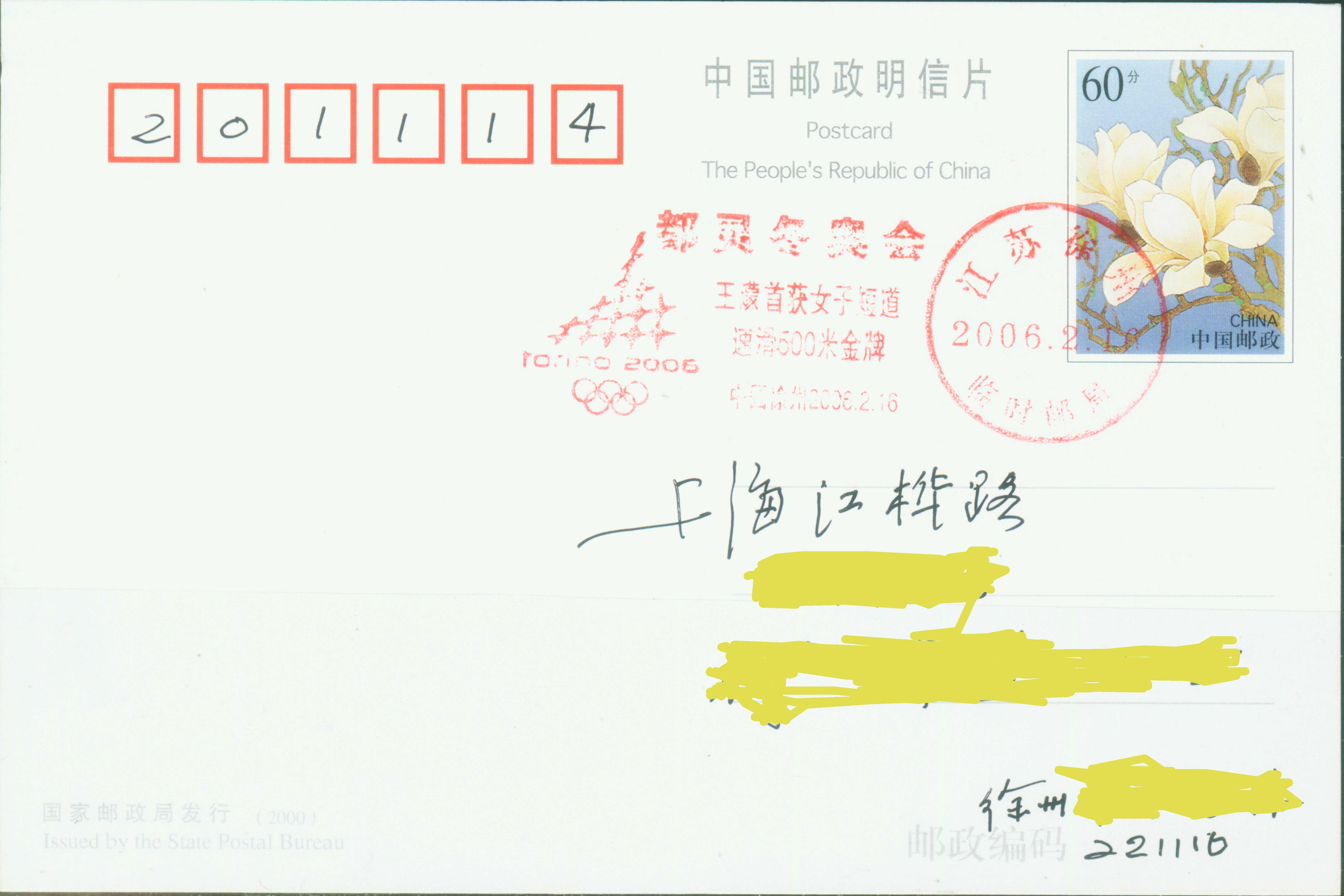 中国短道速滑运动员在冬奥会上,都有不俗的成绩。如在2006年都灵冬奥会上,王蒙以44.345"成绩夺得500 m金牌(图20是江苏徐州为王蒙获得金牌刻制的纪念邮戳); 2010年温哥华冬奥会上 中国女子短道速滑队,包揽了女子500 m、1000 m、1500 m和3000 m接力女子短道速滑项目的全部四枚金牌。