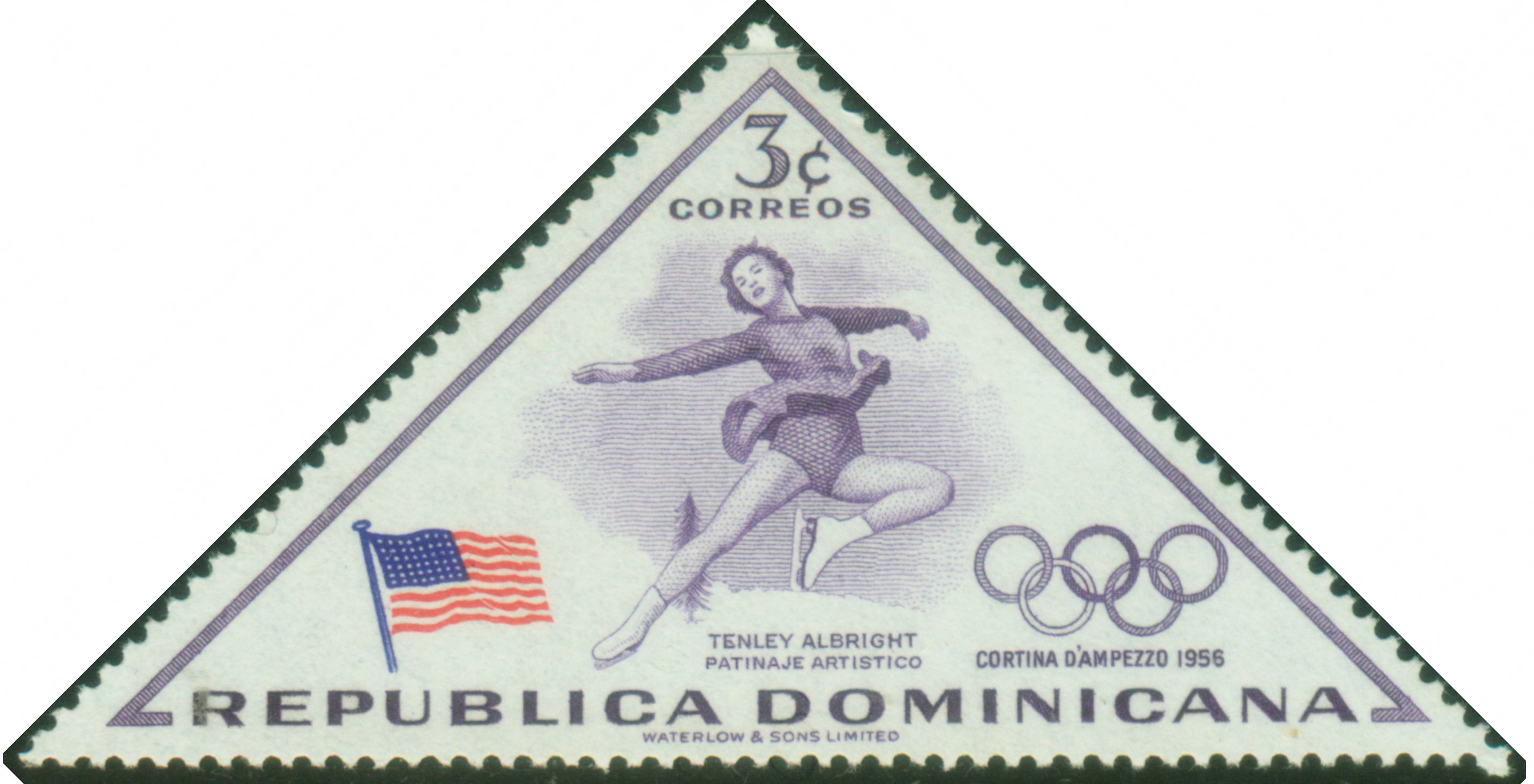 1956年第7届冬奥会上,美国的田莉·奥尔布赖特以169.67分成绩夺得女子花样滑冰金牌。图21是1957年,多米尼加共和国为她夺冠而发行的邮票。