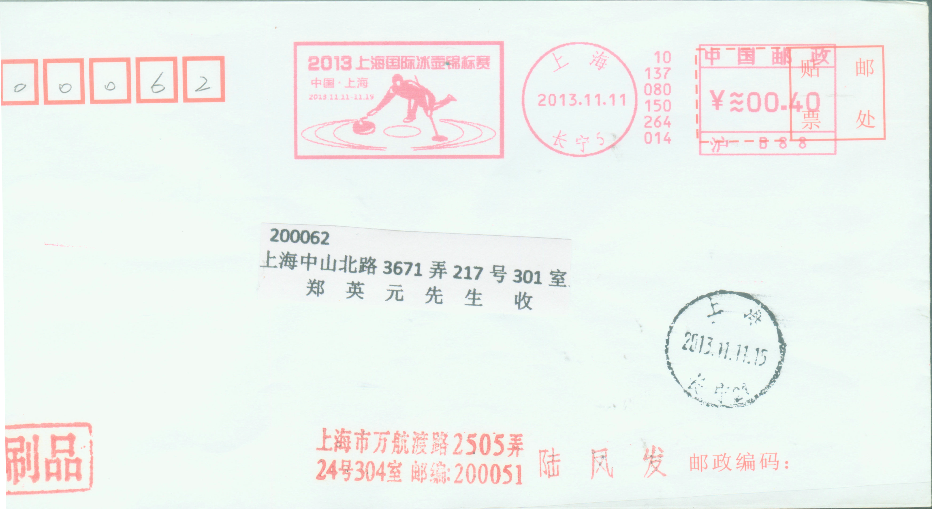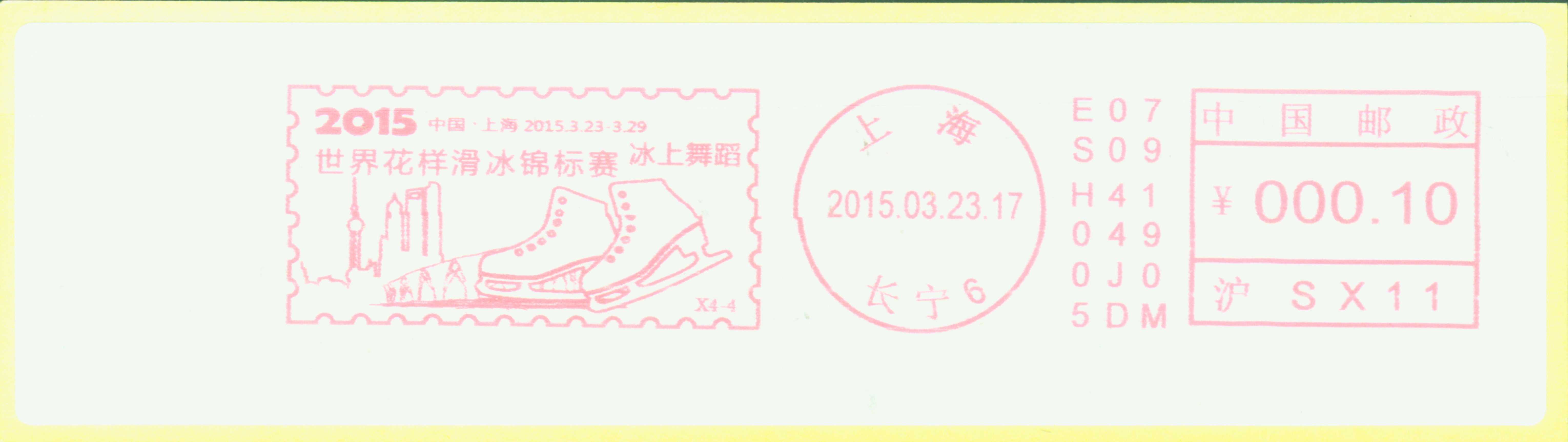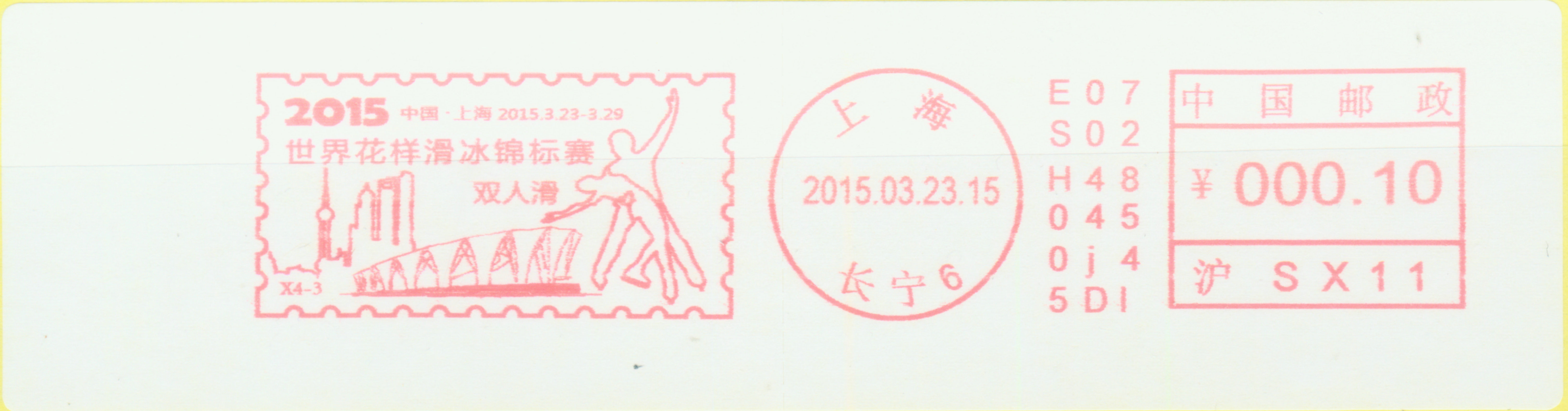 2015年在上海举办“世界花样滑冰锦标赛”, 图23 是上海长宁制作邮资标签中,其中副戳是双人滑。