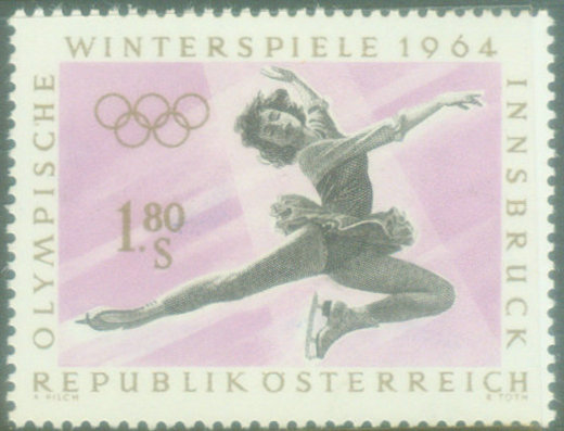 冰上舞蹈:冰上舞蹈是一对男女伴随着音乐的节奏在冰上进行的舞蹈表演(图24是奥地利1964年邮票)。她是从双人滑发展出来,但有别于双人滑。在1976年因斯布鲁克冬季奥运会上冰上舞蹈被首次列人比赛项目。