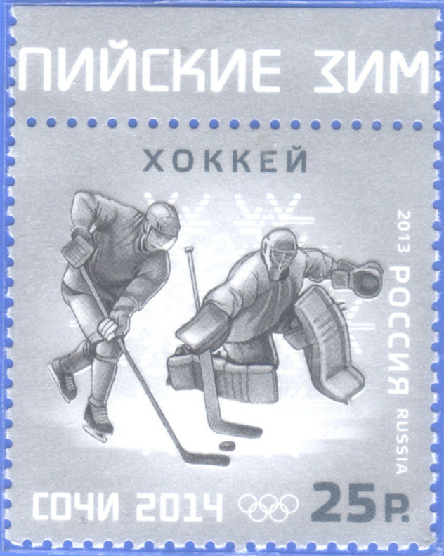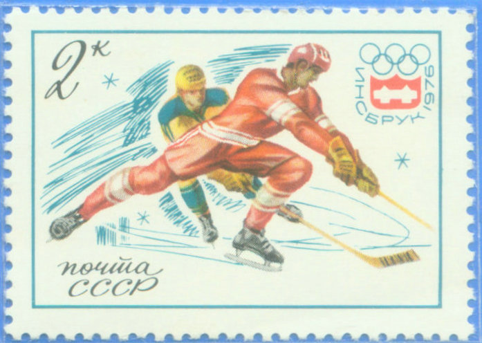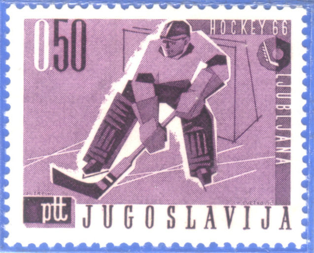 冰球比赛上场队员6人(1名门将、两名防守队员和三名进攻队员),比赛分三局进行,每局20分钟,中间休息15分钟,进一球得1分,得分多者胜。男子冰球1920年列入奥运会,女子1998年列入奥运会。 图26-27是苏联(1964)和南斯拉夫(1966)发行的冰球比赛画面的邮票。