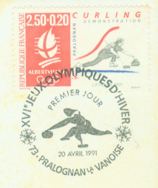 冰壶:冰壶也称为冰上溜石。它是冰上运动的特有比赛项目。冰壶直径30厘米,高11.43 厘米,重量≦19.96 千克。 使用刷冰是为了减小冰壶与冰面间摩擦。冰壶比赛场地长44.5 米、宽4.32 米. 从投球点起约40米远处画有一个半径为0.15、0.61、1.22 和1.83 米的一组同心圆构成的圆垒。 当投出的冰壶离圆垒中心最近的队为胜。冰壶是1998年长野冬奥会重新列入冬奥会比赛项目。图28-29是法国(1991)和俄罗斯(2014)发行的冰壶邮票和刻制的邮戳。