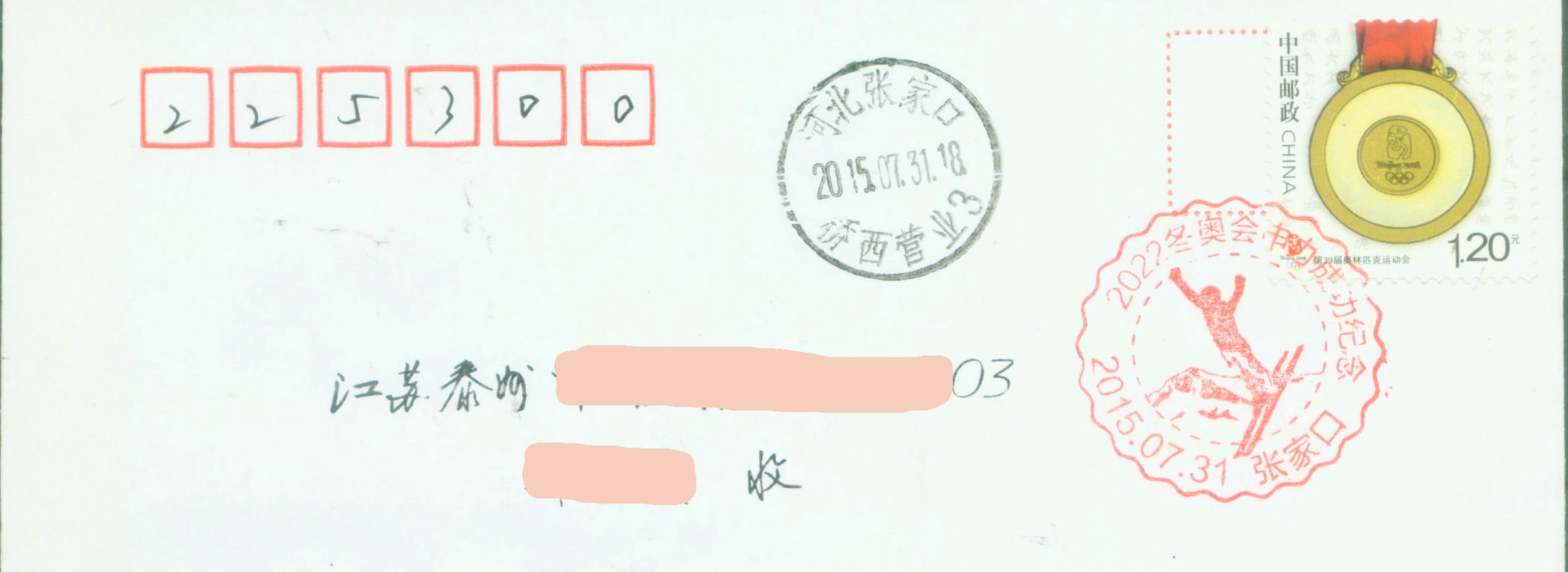 2015年7月31日国际奥委会宣布,北京-张家口获得2022年第24届冬季奥林匹克运动会(简称冬奥会)举办权。北京成为奥运历史上第一个既举办过夏季奥运会, 又将举办冬奥会的城市。当晚,全国沸腾,习近平主席致信祝贺。中国邮政当局为申办成功发行纪念邮票,北京、张家口邮政部门刻制纪念邮戳以作纪念 (图1,图2是当晚从北京、张家口分别寄往山东枣庄和江苏泰州的邮件)。