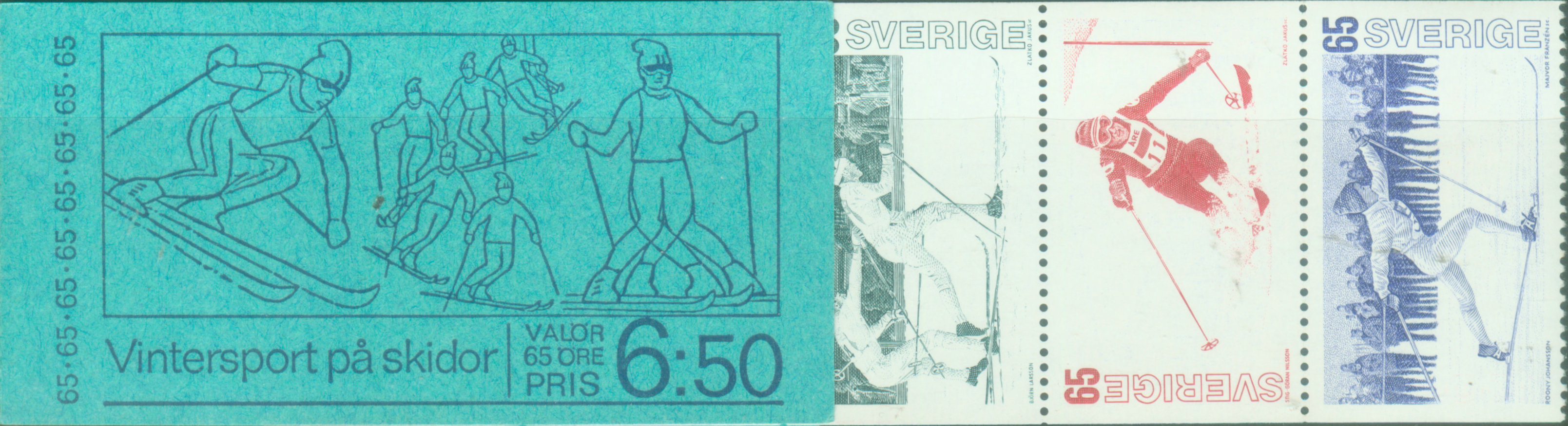 越野滑雪: 越野滑雪是借助滑雪用具,运用登山 、滑降、转弯、滑行等技术,滑行于山丘雪原。1924年就列入冬季奥运会比赛项目。距离有5公里至50公里不等,其中比赛线路应有上坡 、下坡和平地各约占1/3。 成绩按滑完全程所用的时间来确定。图31是瑞士1974年发行的越野滑雪小本票,一套五枚。