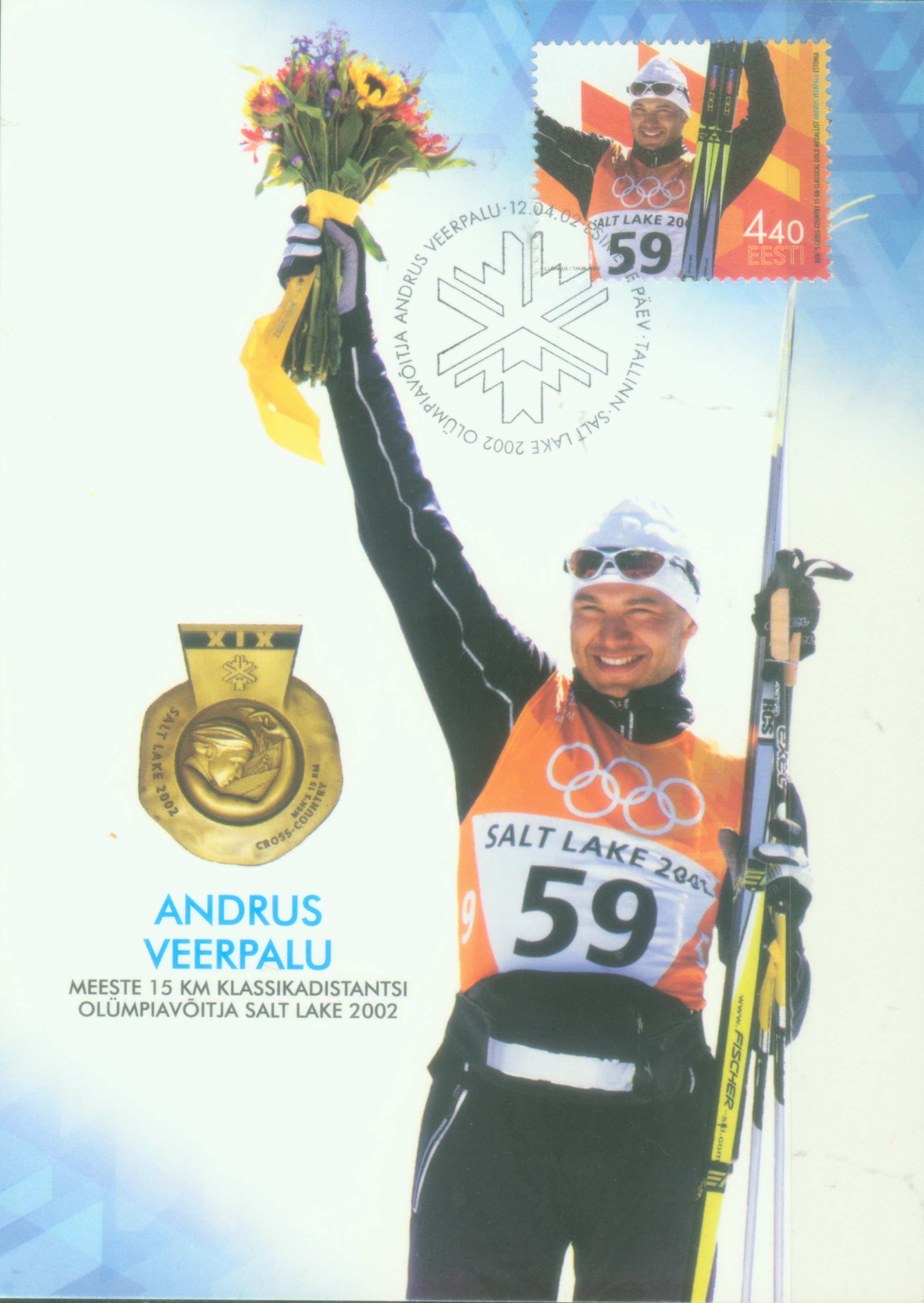 图32是2002年盐湖城冬奥会15 km 越野滑雪比赛,爱沙尼亚选手安·维尔帕鲁以38'01.3"成绩获得金牌。事后,爱沙尼亚发行邮票庆贺并制作极限片。