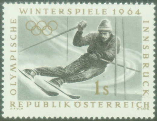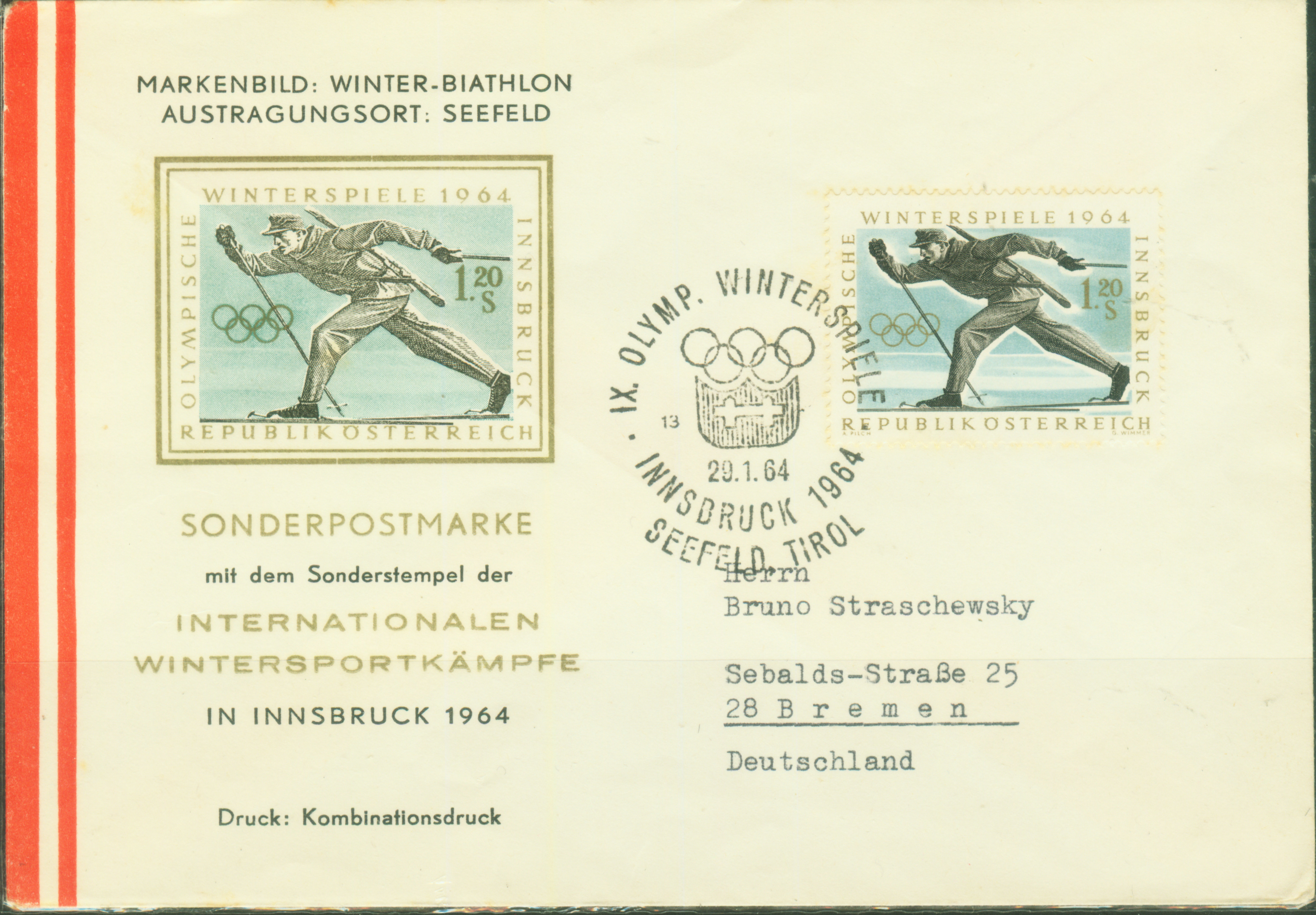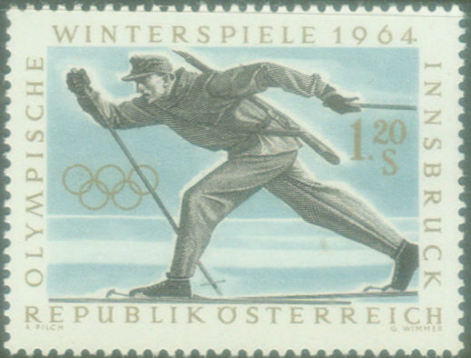 第九届冬奥会于1964年在奥地利因斯布鲁克举行。因斯布鲁克地处阿尔卑斯山下,海拔570米。这次奥林匹克圣火与夏季奥运会一样,取自古奥运会发源地希腊的奥林匹亚。 图9是奥地利为这届冬奥会特制的纪念信封,贴冬奥会纪念邮票,票图为冬季两项,盖这届冬奥会会徽的邮戳。她是这届冬奥会开幕日(1964年1月29日),从比赛场地蒂罗尔州的塞费尔德寄往德国不莱梅。