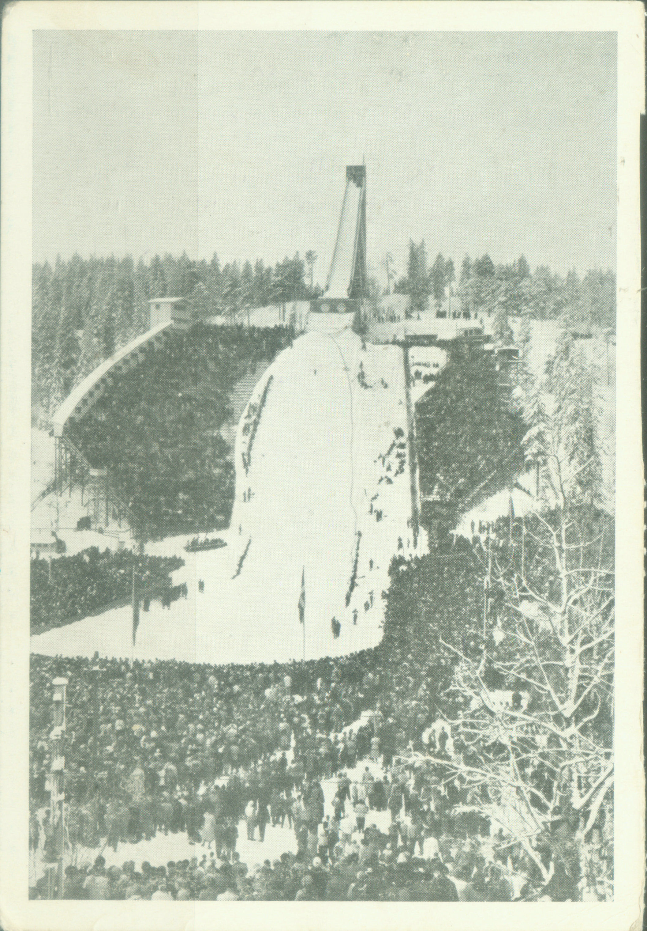 跳台滑雪:跳台滑雪是运动员从滑道上滑下,借助速度和力量向上跳跃,在空中做出技术动作,然后再着陆在跳台的斜坡上向下滑。要求运动员整个身体在空中飞行时间5秒钟后,落在山坡上。 该项目1924年第一届冬奥会就被列为比赛项目。从1964年第9届冬奥会开始跳台级别,分别规定为70 和90 m两种。跳台助滑道坡度35-40度,长度80-100 m。 图35是挪威为1952年奥斯陆冬奥会印制的明信片,呈现该项目的跳台和滑道。