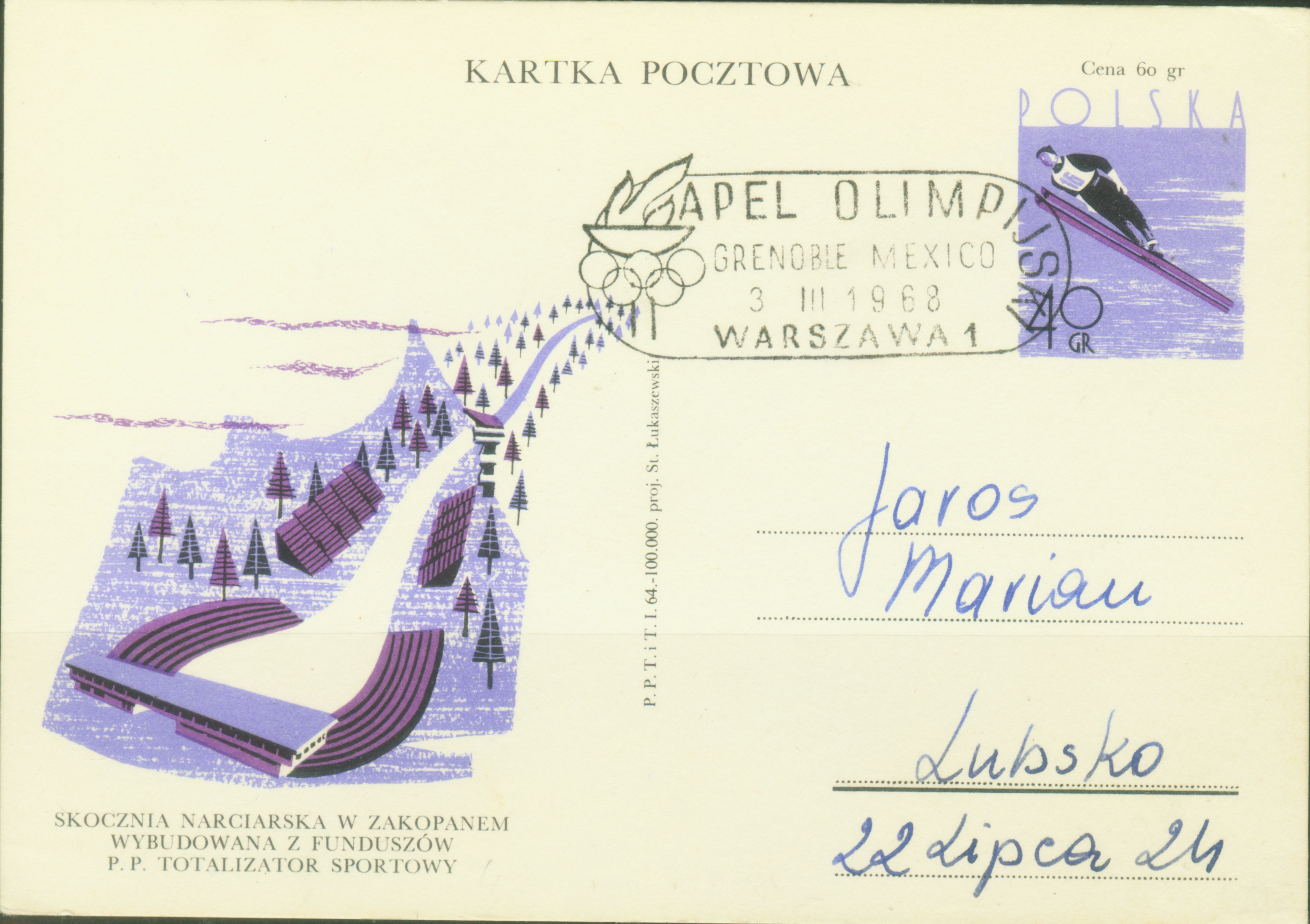 图36是波兰为1968年冬奥会发行的邮资明信片,片图是波兰著名的扎科帕内跳台滑雪道和跳台滑雪运动员。