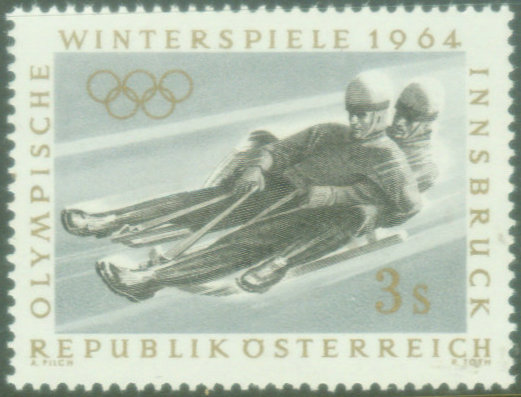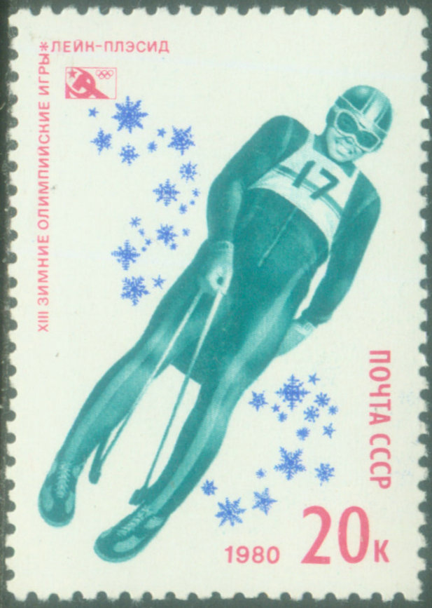 雪橇:雪橇是雪上运动器材,冬奥会采用无舵雪橇和有舵雪橇进行竞赛。有舵雪橇于1924年就成为冬奥会的比赛项目,设有男子双人、四人及女子双人三个小项。 无舵雪橇在冬奥会上设有男子单人、双人与女子单人三个小项。下面图37是1964年冬奥会邮票,画面是双人雪橇是各国为冬奥会发行的雪橇邮票。图38是苏联1980冬奥会邮票,画面是单人雪橇。