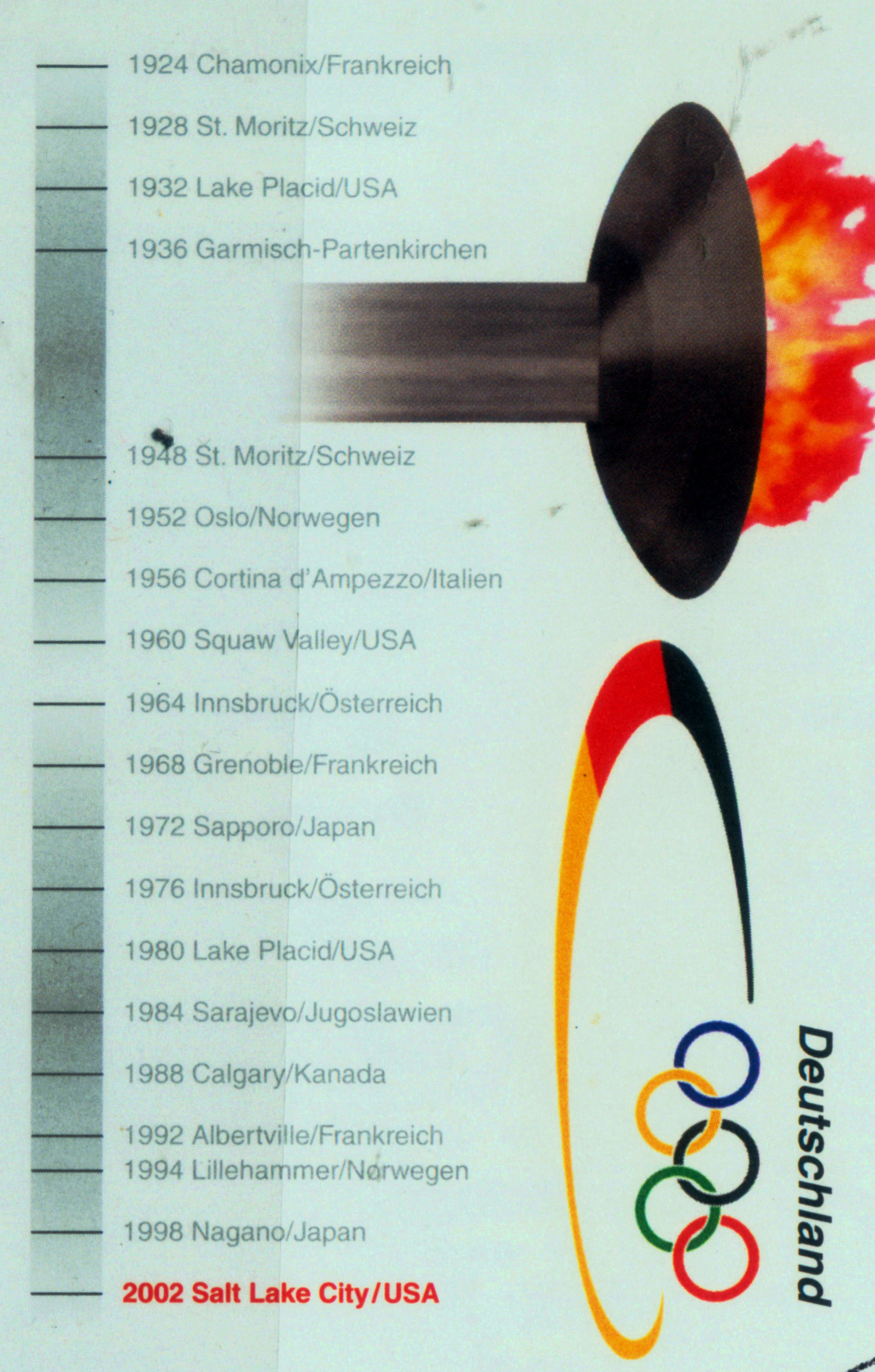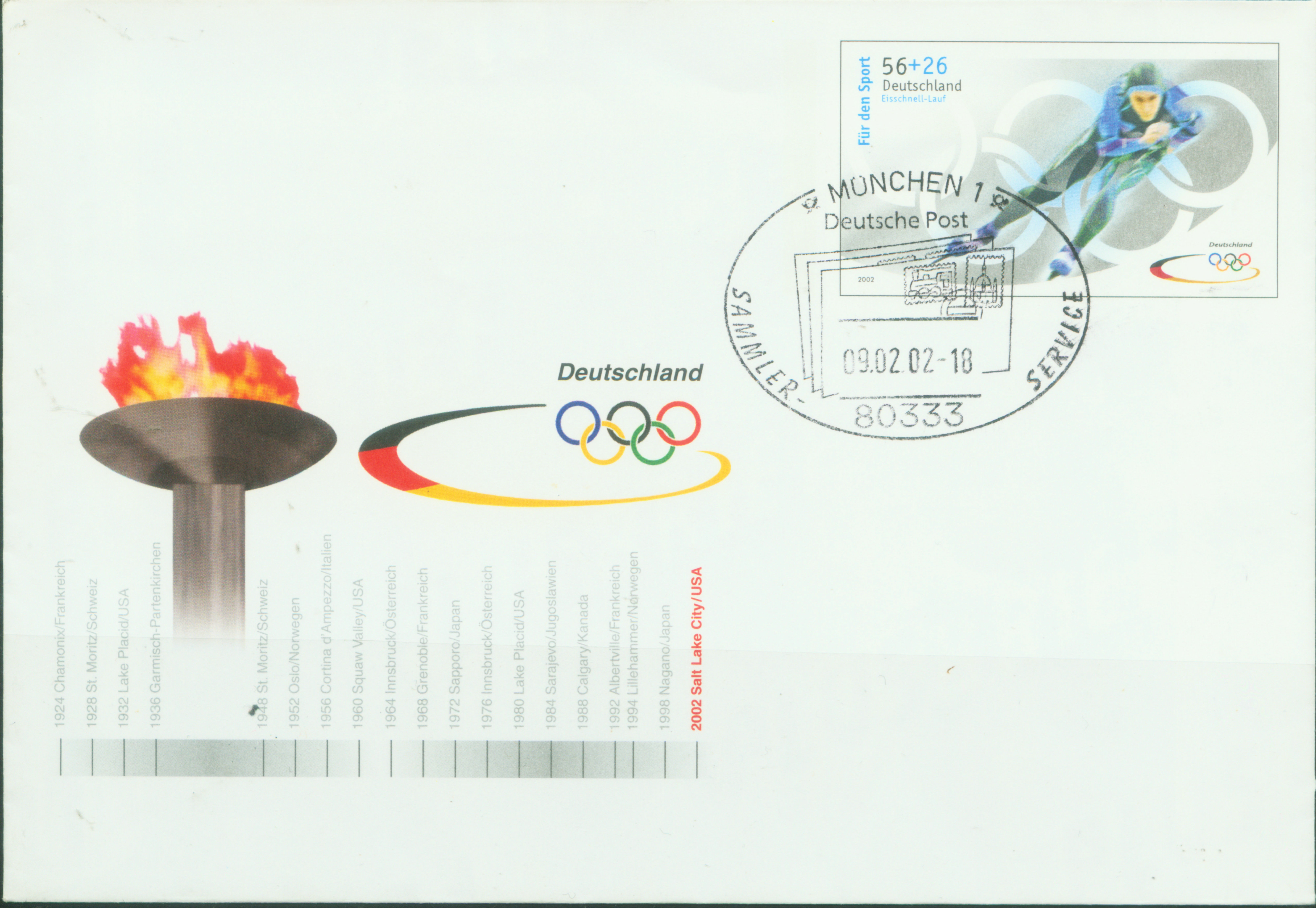 1928年2月11日至19日在瑞士圣莫里兹举行的第二届冬奥会。这两届都没有意识到发行邮票进行宣传。 直到2002年德国为当年在美国犹他州盐湖城举办第19届冬奥会时,发行一枚邮资信封上(图3,图4是图3的局部放大图),罗列了前19届冬奥会的举办的年份、地点和国家。使我们一目了然。