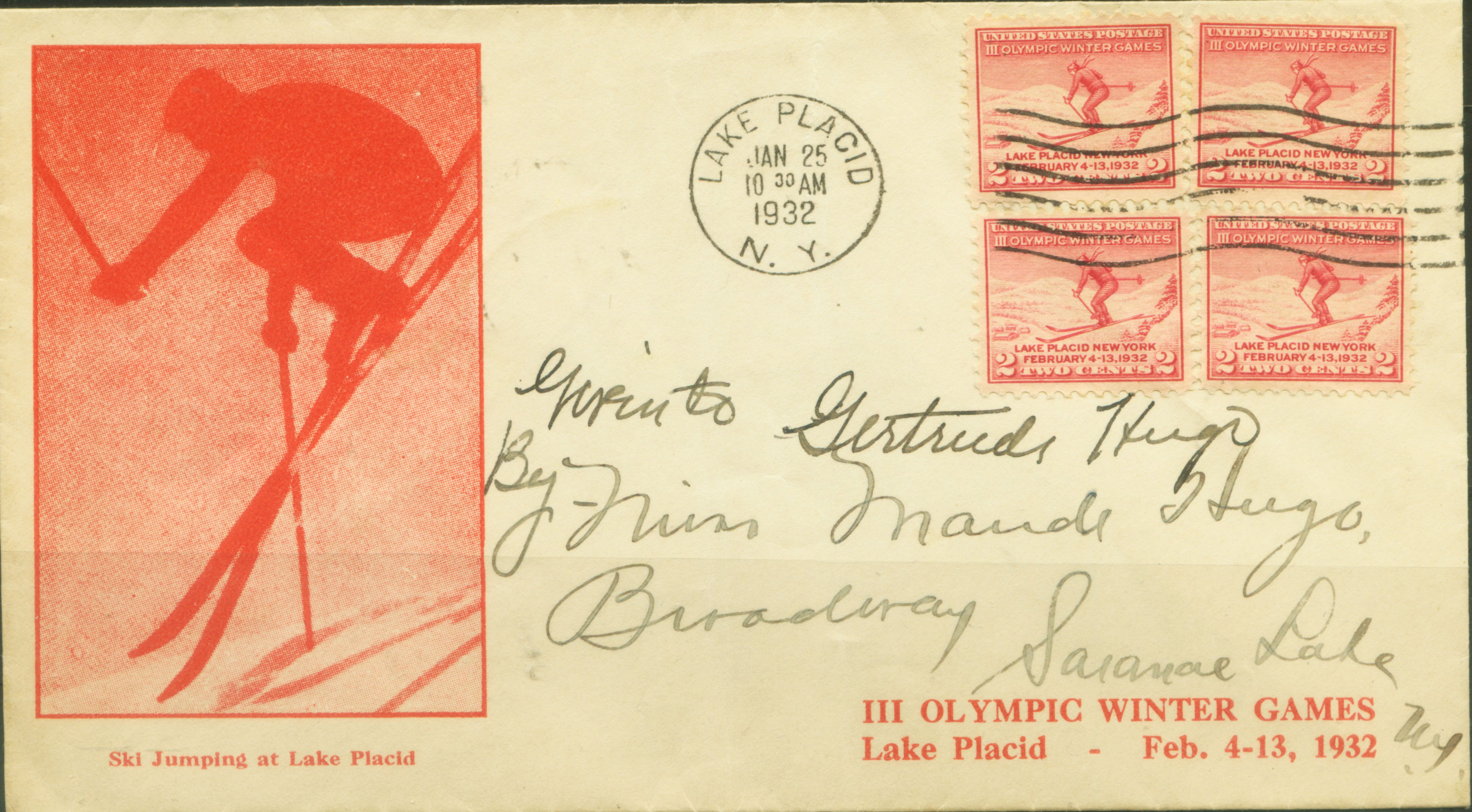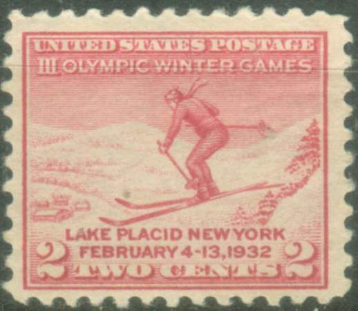 当然不是在2002年之前没有国家发行冬奥会邮票,只是罗列冬奥会历史的没有。例如,1932年在美国纽约州普莱西德湖举行的第三届冬季奥运会。美国早在1932年1月25日就为这届冬奥会发行了一枚纪念邮票 (图5,图6是贴这枚邮票并首日从普莱西德湖寄出,信封印有本届冬奥会举办地点和时间)。由于刚刚经历了一场全球范围的经济大萧条影响,只有17个国家派队参加,冬季运动强国欧洲来的人很少, 而北美的美国、加拿大运动员占了一半左右。