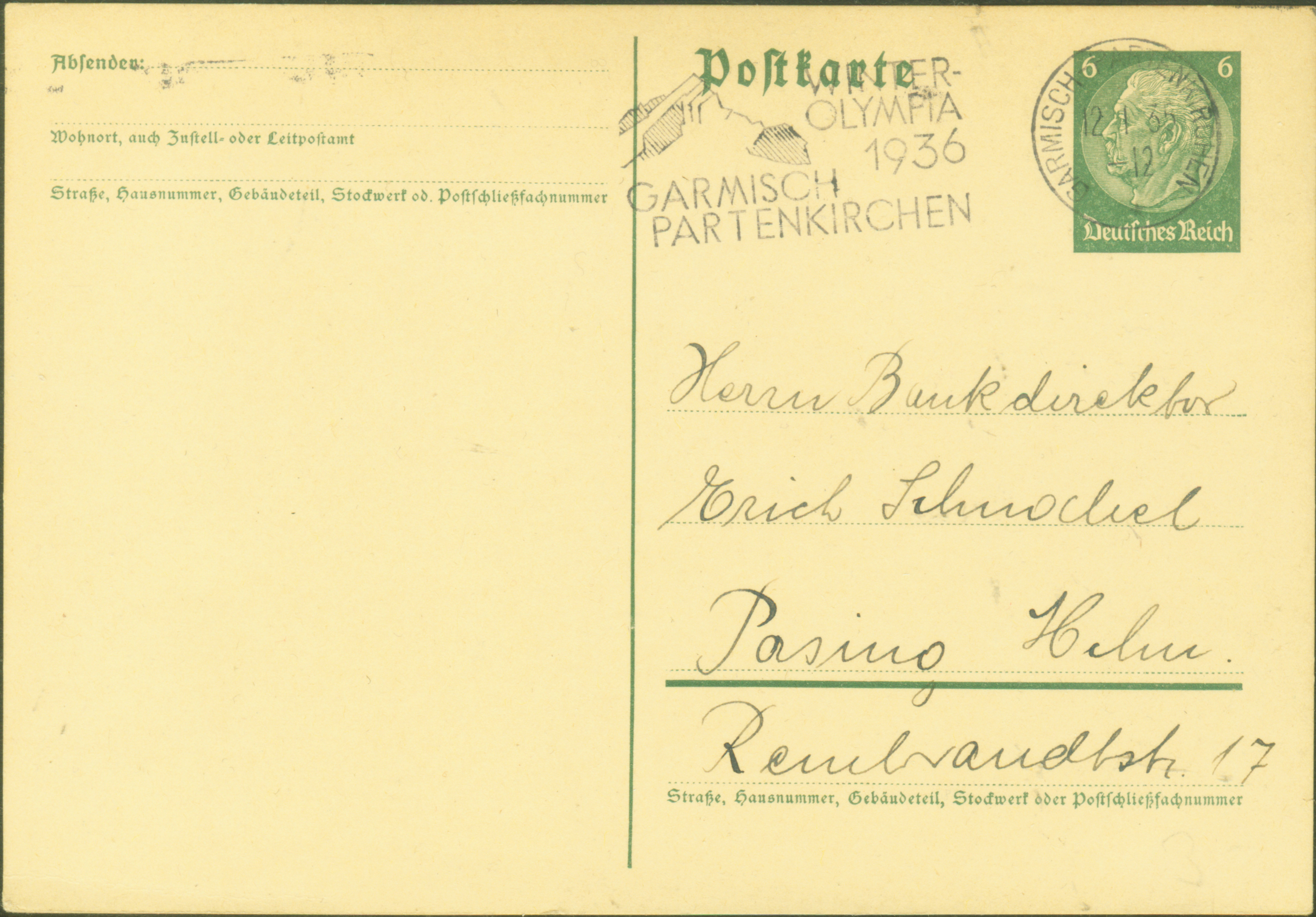 第四届冬奥会于1936年在德国的加米施和帕滕基举行。德国加米施和帕滕基从前是两个小镇,座落在巴伐利亚阿尔卑斯山中央720米的高处,由于冬奥会的举办,使这两个地区合并成一个镇, 也成为德国著名的冬季运动之都(图7是1935年1月12日从加米施-帕滕基寄出,盖1936年冬奥会纪念邮戳)。