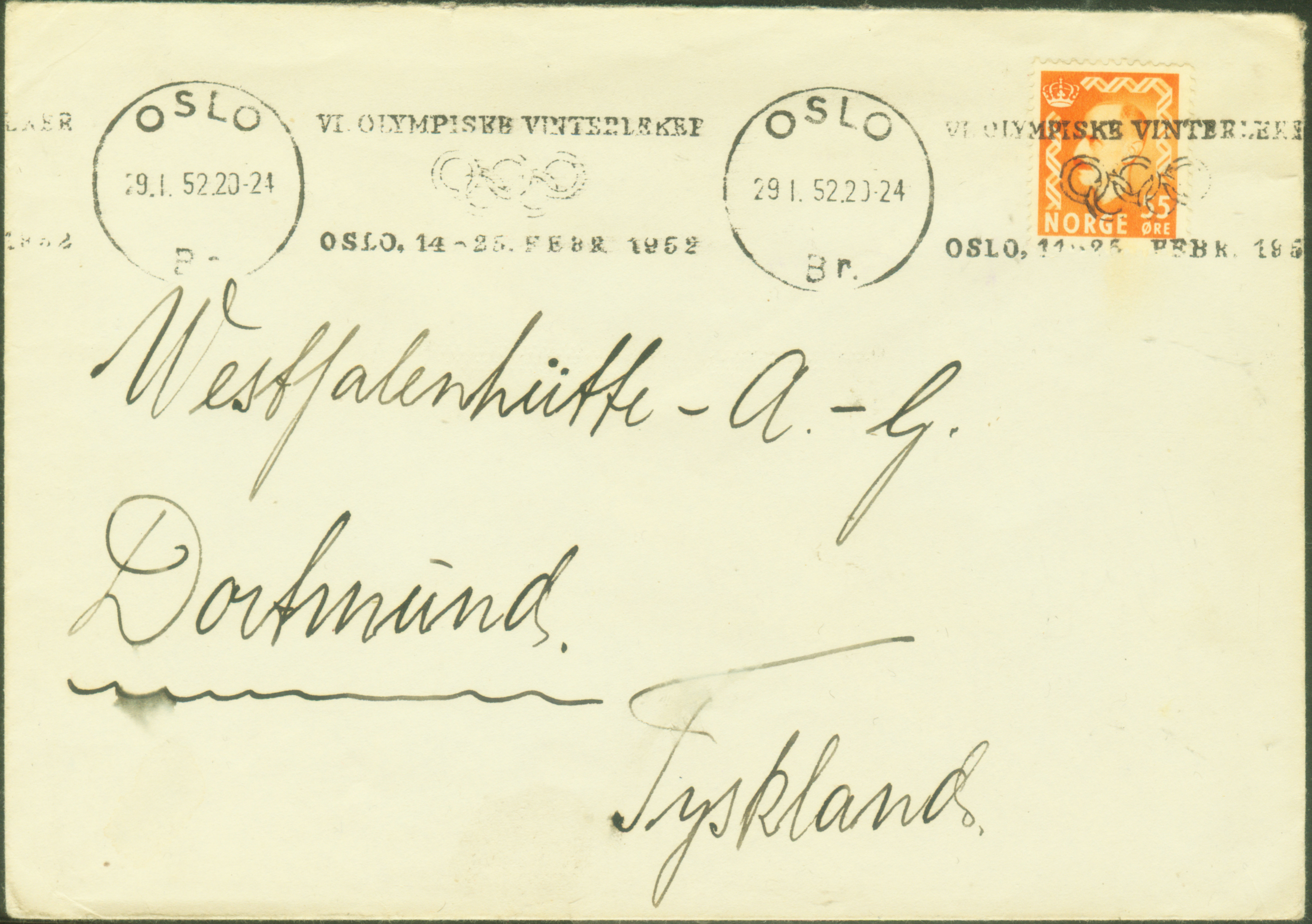 1952年第六届冬季奥运会来到挪威的奥斯陆(图8是1952年1月29日从奥斯陆寄往德国的邮件,盖第六届冬奥会时间地点的纪念邮戳)。本届冬季奥运会中首次在主会场燃烧了奥林匹克火焰。
