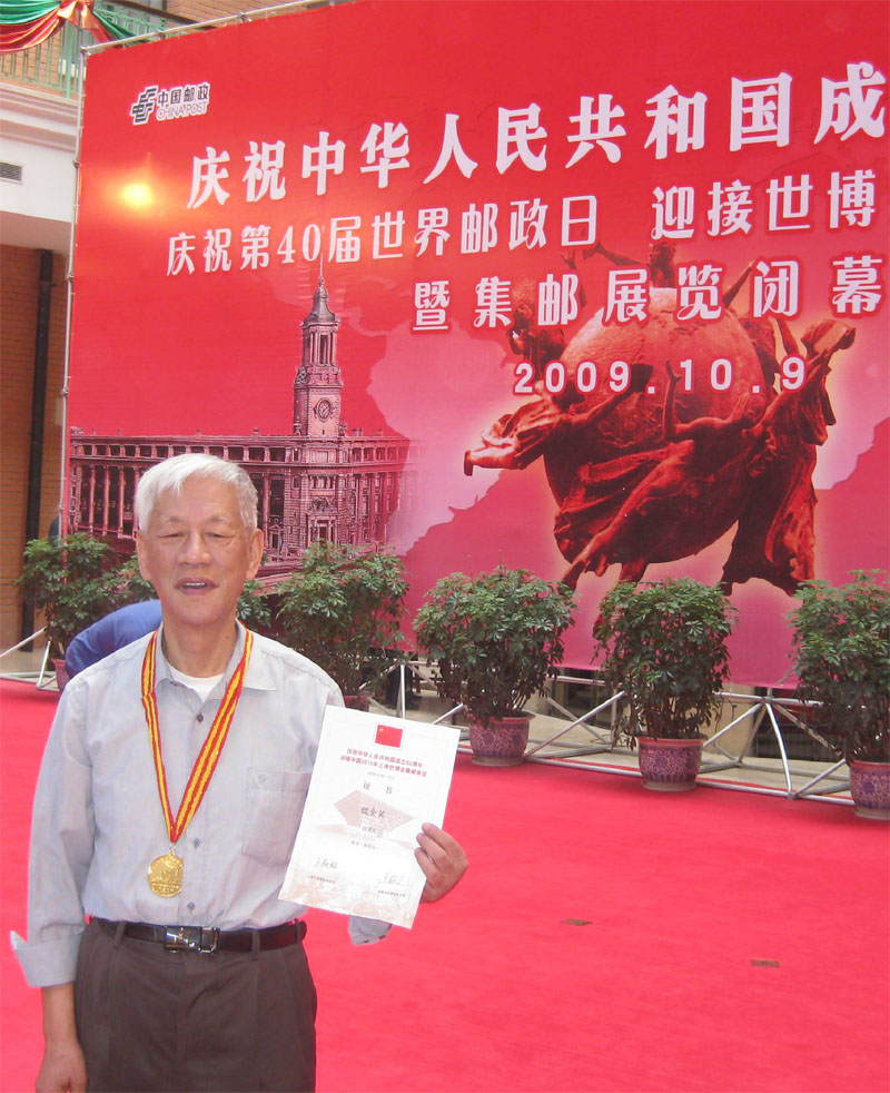 2008年夏天萌发了想收集世博会的邮品,以便了解世博150多年的历史,如有可能也可以借此机会与大家共享世博。经过一年的努力,通过国内外各种渠道, 到2009年夏天,我已经收集到与世博相关的邮品(包括:邮品、明信片、实寄信封、邮戳等)5-6百件。 正好这年上海市要在国庆节举办“庆祝国庆60周年暨迎接上海世博会”的竞赛性综合集邮展览(图1)。于是我把我的邮品组成一部取名为《走进世界博览会》的邮集, 介绍150多年的世博会历史和上海为筹办世博会所做的努力。我的邮集在竞赛展出中获得镀金奖(图2),2009年10月9日在市里的颁奖大会上我上主席台领取奖状, 并被挂上奖牌(图3)。现在,我计划写几篇短文配上相关邮品向大家介绍世博会的历史,几届大型世博会的背景与风采,以及上海世博会概况,请大家批评指正。