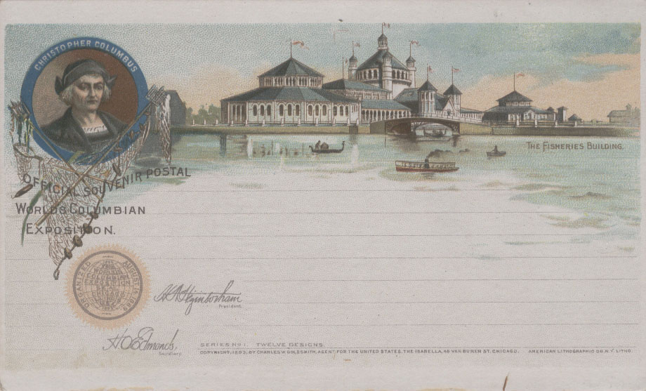 由于这届世博会的主题是纪念哥伦布发现新大陆400周年,因此美国邮政当局在当时还发行四枚纪念哥伦布的邮资信封(图15是其中的一枚, 邮资图中的头像分别是哥伦布与自由女神。)这里特别要提到美国当时还发行一套16枚纪念哥伦布的邮票,邮票的画面是介绍哥伦布发现新大陆的艰难历程。 这也是世博会历史上为世博会而发行的第一套纪念邮票。目前全套新票的价格在10万元人民币左右。下面图16是其中的一枚面值3c的信销旧票, 它的画面是哥伦布的“圣玛丽亚”号旗舰。